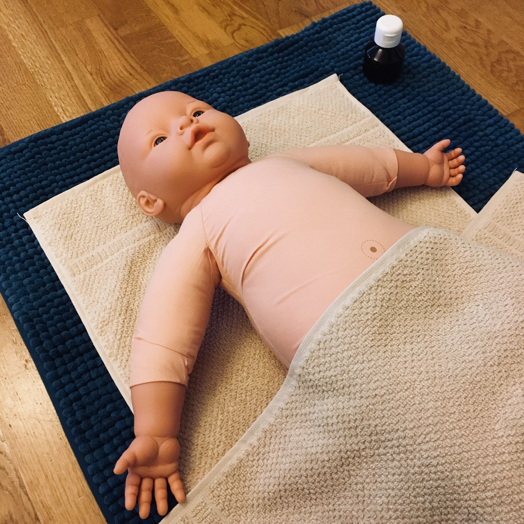 Je montre les gestes sur un poupon de massage et vous pouvez immédiatement appliquer le massage à votre bébé.